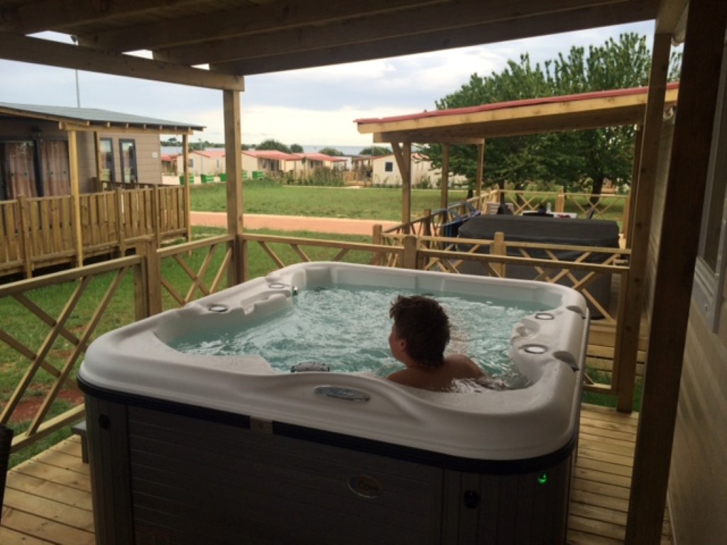 Opustite se na terasi svoje komforne mobilne kućice, uživajte u vlastitoj velikoj terasi s relax zonom s hidromasažnom kadom